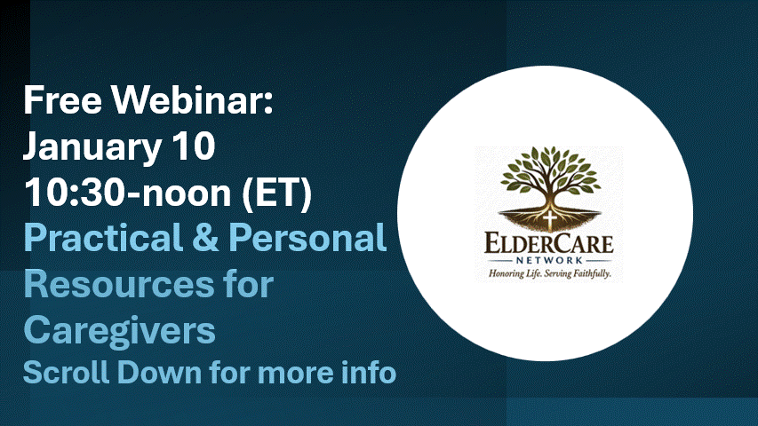 Beginning in 2026, The ElderCare Network will offer a series of free, live monthly webinars on Zoom on the morning of the second Saturday of each month (10:30-noon, ET), with the recording repeated with a live facilitator a week and a half later, aß Wednesday evening at 7:30 (ET). These Webinars are designed to inspire (heart), inform (head), and equip (hands). Topics will include: